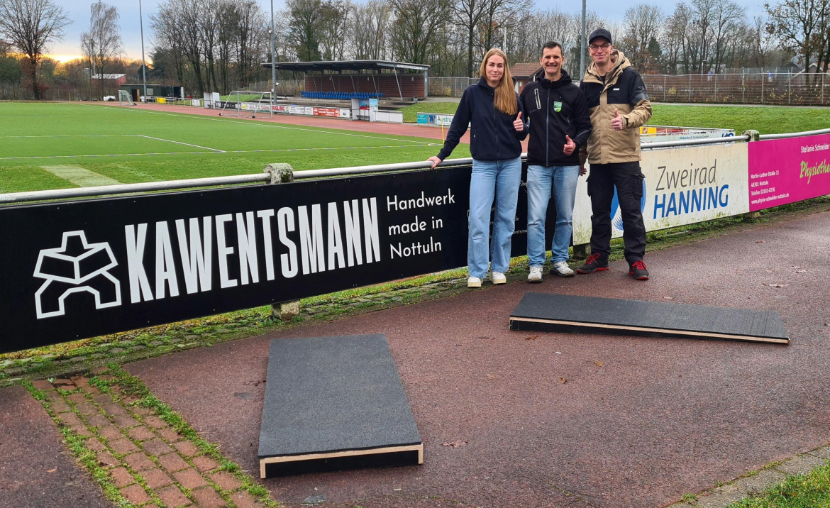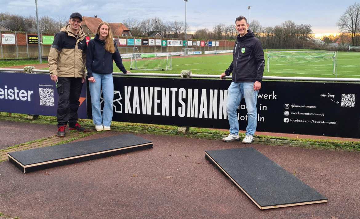 „Tolle Beratung und Umsetzung. Mit zwei Telefonaten und einer Skizze hatten wir die Sprungkeile in Größe und Format geklärt. Die Zusammenarbeit war sehr professionell. Danke euch für die Unterstützung.“ so Stefan Bolz für die Leichtathleten bei der Übergabe durch Leonie Bayer-Eynck und Patrick Doerfert von der Firma Kawentsmann. „Wenn wir heimische Vereine unterstützen können, machen wir das gerne“ so Leonie.